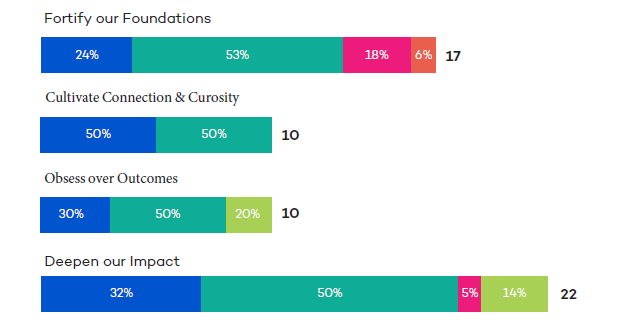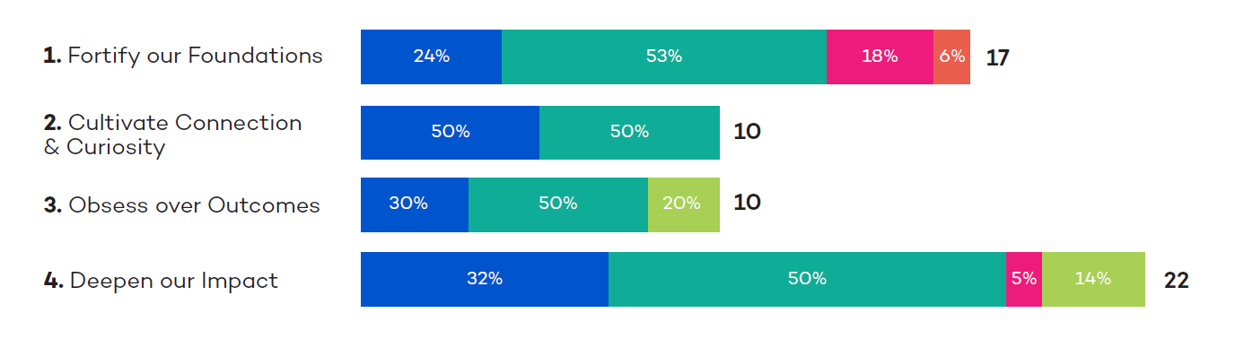 There are 14 specific objectives that sit under these 4 goals and a further 59 specific actions. These actions can be summarised as follows, where blue indicates an action yet to formally start, teal is underway, green is complete, pink is on hold and orange indicates an action that is delayed. The number at the end of each bar represents the number of actions specific to each goal.